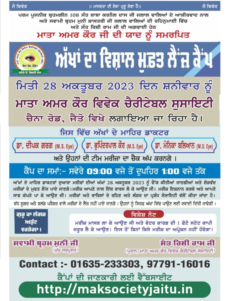 HOME News Top Slide ਮਿਤੀ 28 ਅਕਤੂਬਰ 2023 ਦਿਨ ਸ਼ਨੀਵਾਰ ਨੂੰ ਮਾਤਾ ਅਮਰ ਕੌਰ ਵਿਵੇਕ ਚੈਰੀਟੇਬਲ ਸੁਸਾਇਟੀ ਚੈਨਾ ਰੋਡ, ਜੈਤੋ ਵਿਖੇ ਲਗਾਇਆ ਜਾ ਰਿਹਾ ਹੈ MAK October 18, 2023 Contact :- 97791-16016 ਕੈਂਪਾਂ ਦੀ ਜਾਣਕਾਰੀ ਲਈ ਵੈੱਬਸਾਈਟ https://maksocietyjaitu.in ( ਮਾਤਾ ਅਮਰ ਕੌਰ ਵਿਵੇਕ ਚੈਰੀਟੇਬਲ ਸੋਸਾਇਟੀ) Continue Reading Previous Today Eye Camp 29-9-2023 JaituNext ਮਹਾਨਦਾਨੀ ਪੂਜਨੀਕ ਮਾਤਾ ਅਮਰ ਕੌਰ ‘ਦੁੱਲਦ’ ਜੀ ਦੀ ਸਲਾਨਾ ਬਰਸੀ ਸ੍ਰੀ ਵਿਵੇਕ ਆਸ਼ਰਮ, ਚੈਨਾ ਰੋਡ, ਜੈਤੋ ਵਿਖੇ ਬੜੀ ਸ਼ਰਧਾ ਪੂਰਵਕ ਨਾਲ ਮਨਾਈ ਜਾ ਰਹੀ ਹੈ| More Stories Casino HOME mostbet apk mostbet azerbaijan News ਰਾਧਾ ਰਾਣੀ ਚੈਰੀਟੇਬਲ ਟਰੱਸਟ ਬਰੀਵਾਲਾ ਮਿਤੀ 28 ਫਰਵਰੀ 2026 ਦਿਨ ਸ਼ਨੀਵਾਰ ਨੂੰ ਸਥਾਨ: ਪੰਚਾਇਤੀ ਧਰਮਸ਼ਾਲਾ, ਮੰਡੀ ਬਰੀਵਾਲਾ ਵਿਖੇ ਲਗਾਇਆ ਜਾ ਰਿਹਾ ਹੈ। MAK February 18, 2026 HOME News 14 FEB 2026 MAK February 11, 2026 HOME News Top Slide ਪੁੰਨਿਆ ਦੇ ਸ਼ੁਭ ਅਵਸਰ ਤੇ 40ਵਾਂ ਅੱਖਾਂ ਦਾ ਮਫ਼ਤ ਲੈਂਜ ਕੈਂਪ 1-2-2026 MAK January 19, 2026