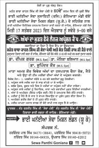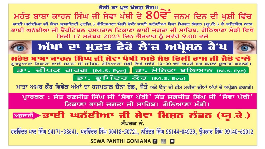 ਮਹੰਤ ਬਾਬਾ ਕਾਹਨ ਸਿੰਘ ਜੀ ਸੇਵਾ ਪੰਥੀ ਅਤੇ ਸੰਤ ਰਿਸ਼ੀ ਰਾਮ ਜੀ ਜੈਤੋ ਵਾਲੇ ਗੁਰਦੁਆਰਾ ਟਿਕਾਣਾ ਭਾਈ ਜਗਤਾ ਜੀ ਸਾਹਿਬ, ਗੋਨਿਆਣਾ ਮੰਡੀ ਵਿਖੇ ਸਵੇਰੇ 9-00 ਵਜੇ ਅਪਣੇ ਕਰ ਕਮਲਾਂ ਦੁਆਰਾ ਕਰਨਗੇ। ਡਾ. ਦੀਪਕ ਗਰਗ (M.S. Eye) ਡਾ. ਮੋਨਿਕਾ ਬਲਿਆਨ (M.S. Eye)